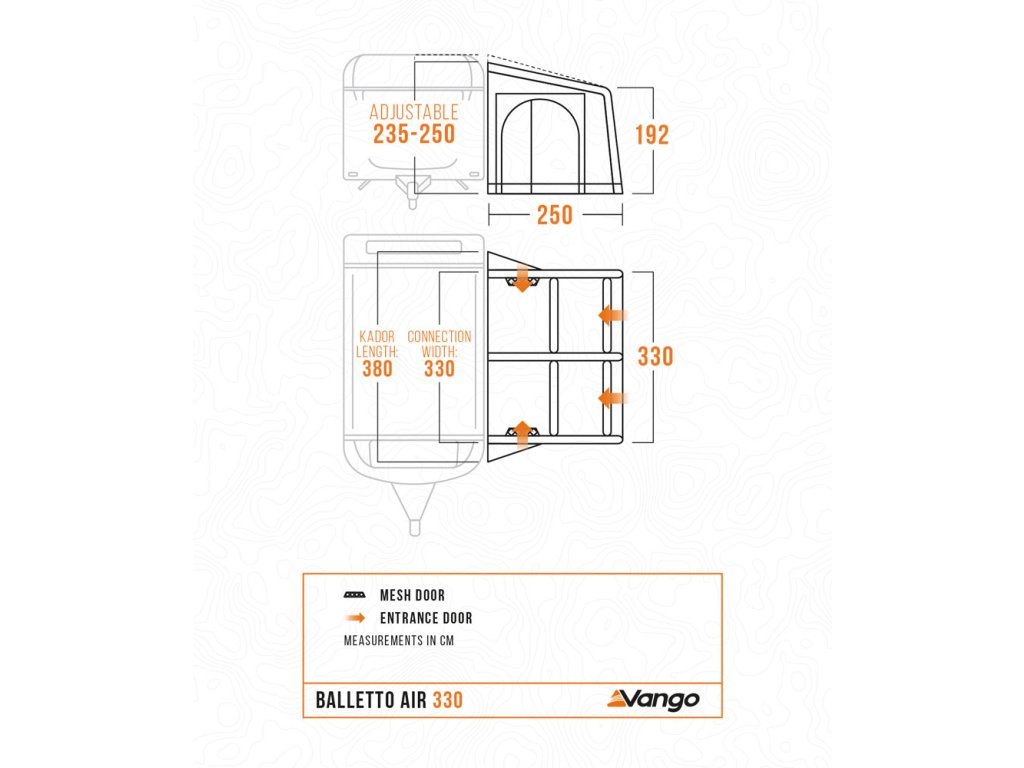 1) Výška - předstany Vango jsou navrženy tak, aby se hodily pro karavany různých výšek, mezi 235 cm a 250 cm. Při měření výšky karavanu se ujistěte, že stojíte na rovném povrchu a že je karavan také rovný. Měřte od země k horní části kolejnice, která vede podél horní části dodávky.