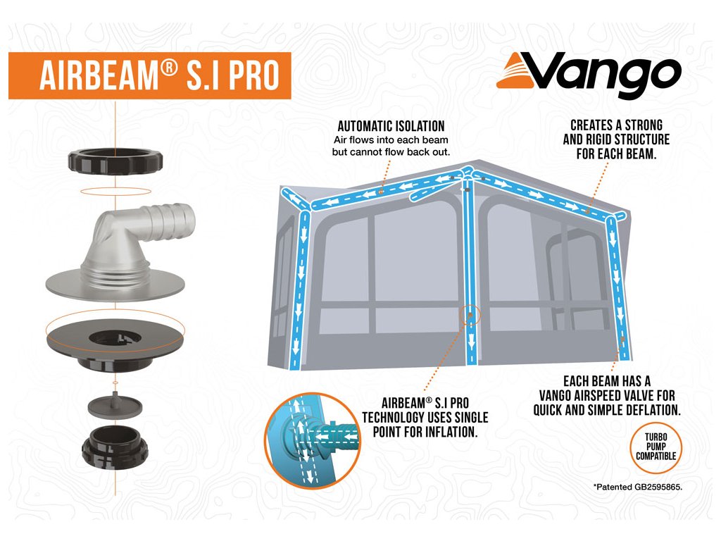Vango je aktualizovaná verze svého revolučního systému rychlého a snadného nafukování pomocí ventilu AirSpeed S.I Pro. Náš unikátní systém zajišťuje minimalizaci doby nafukování, zatímco více ventilů AirSpeed pomáhá s jednoduchým vyfukováním. Patent GB2595865 -