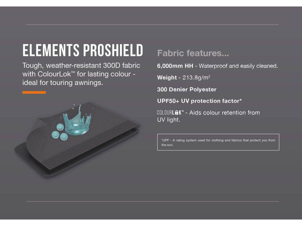 Tkanina Elements ProShield Lehká, kompaktní a odolná. Naše tkanina 300D se pyšní voděodolností 6 000 mm a technologií ColourLok, která zachovává zářivé barvy při každém dobrodružství. -