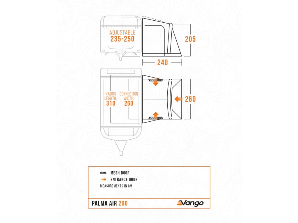 1) Výška - předstany Vango jsou navrženy tak, aby se hodily pro karavany různých výšek, mezi 235 cm a 250 cm. Při měření výšky karavanu se ujistěte, že stojíte na rovném povrchu a že je karavan také rovný. Měřte od země k horní části kolejnice, která vede podél horní části dodávky.