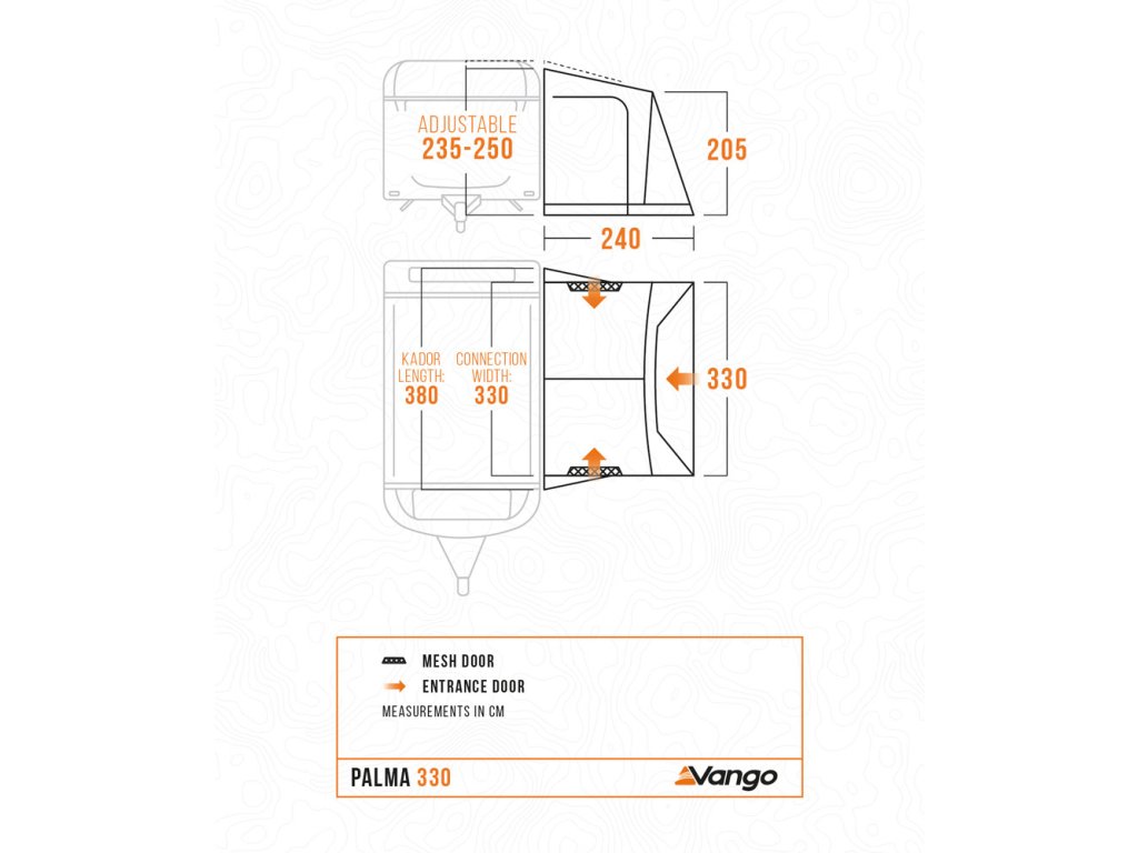 1) Výška - předstany Vango jsou navrženy tak, aby se hodily pro karavany různých výšek, mezi 235 cm a 250 cm. Při měření výšky karavanu se ujistěte, že stojíte na rovném povrchu a že je karavan také rovný. Měřte od země k horní části kolejnice, která vede podél horní části dodávky.