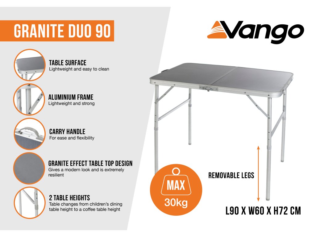Stůl Vango Granite Duo 90 Table je středně velký kempingový stůl určený pro 2 až 4 osoby. Stůl má rozměry 90 x 60 x 70 cm (délka x šířka x výška) a váží 3,64 kg.